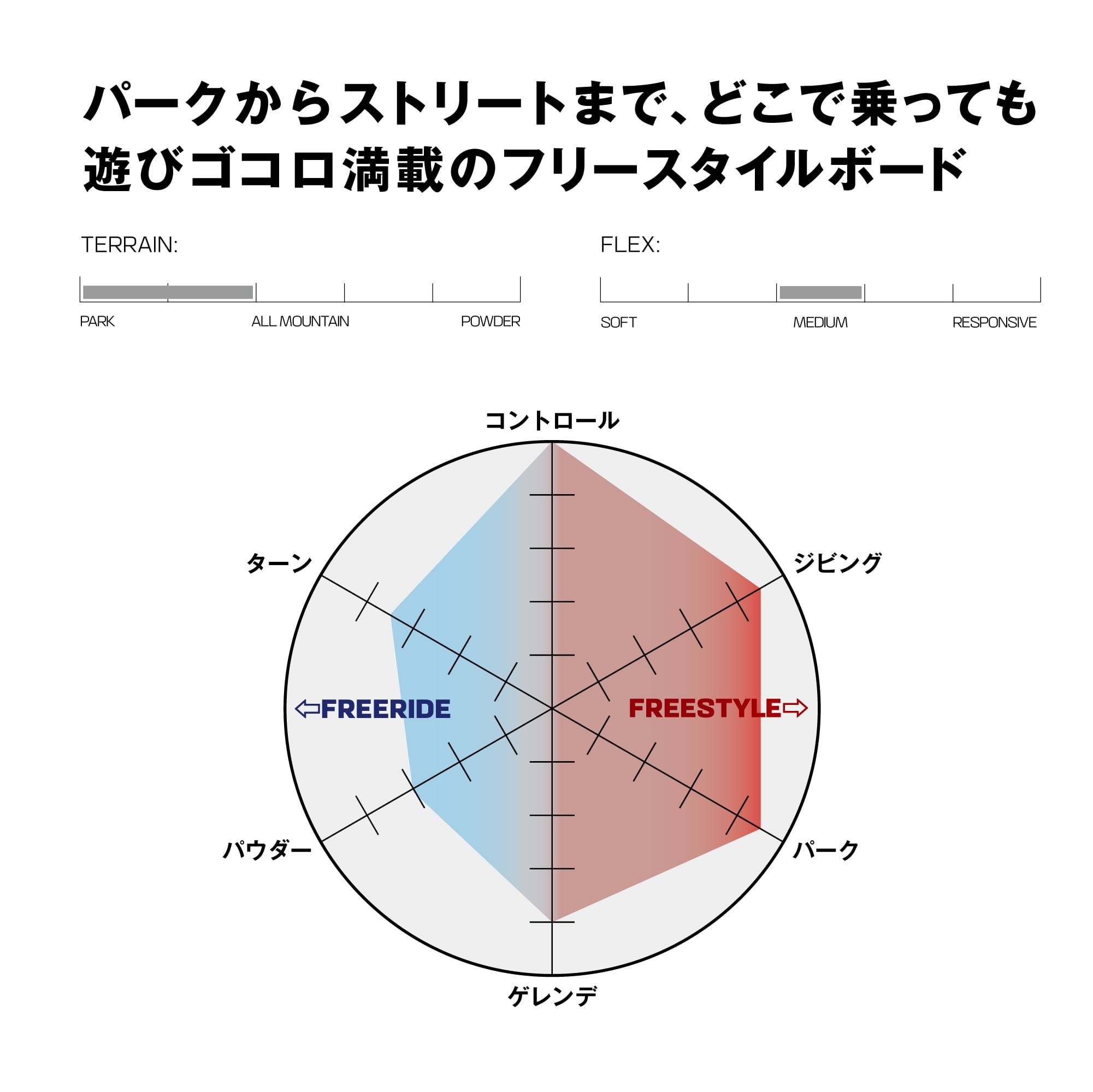 『スタイルと表現の限界を超えるAbstractは何年にもわたるフリースタイルボードの開発とライダーたちからのフィードバックが合わさった集大成です。このミッドフレックスのユニセックスボードには、最もポピュラーなロックアウトキャンバーとクアドラライザーサイドカットを採用し、パークやストリート、どこで乗っても万能で遊び心が満載のボードになっています』