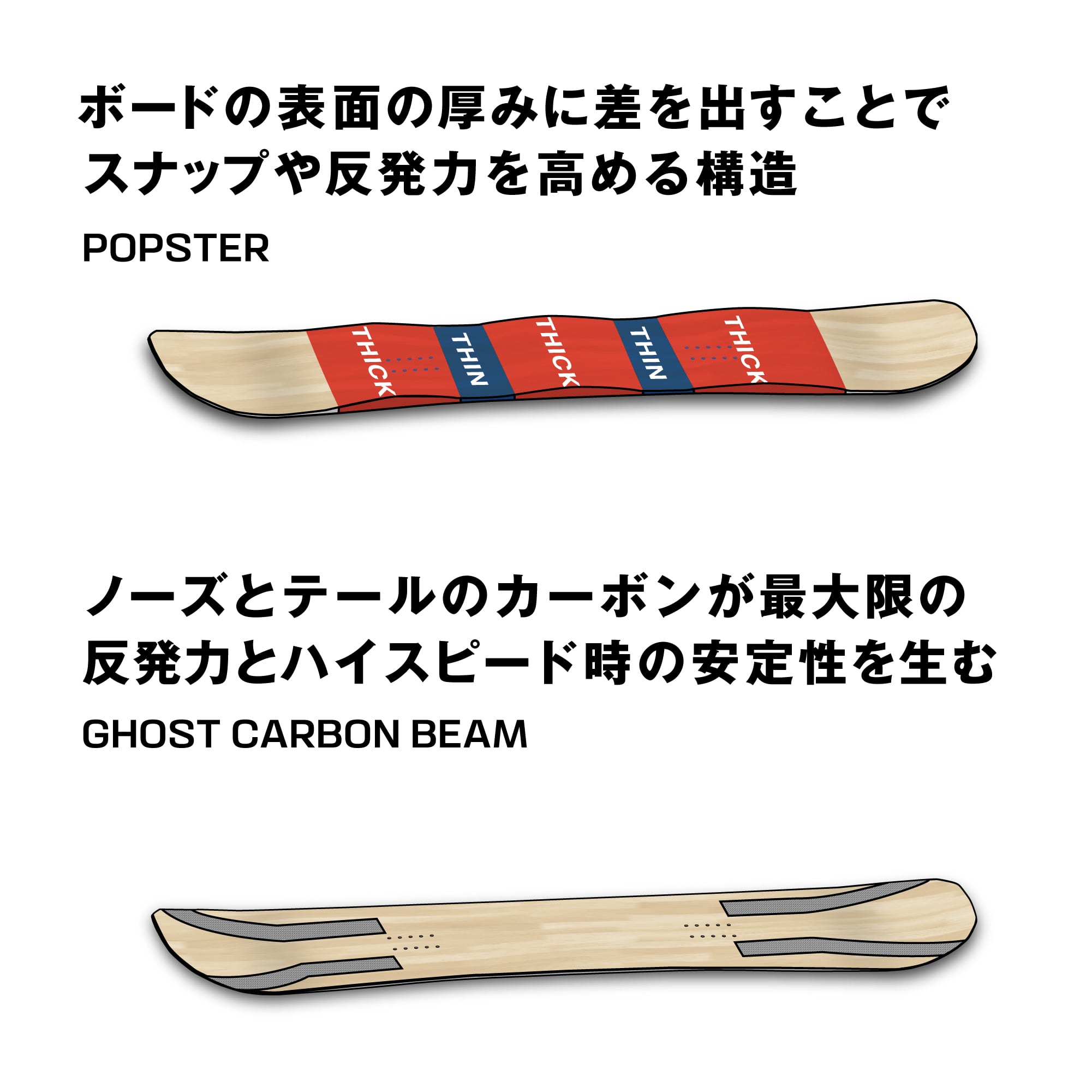 Ghost Carbon Beams:2本のカーボン繊維の束を、ノーズとテールに走らせることで、最大限の反発力とハイスピード滑走時の安定性を得る加工技術。