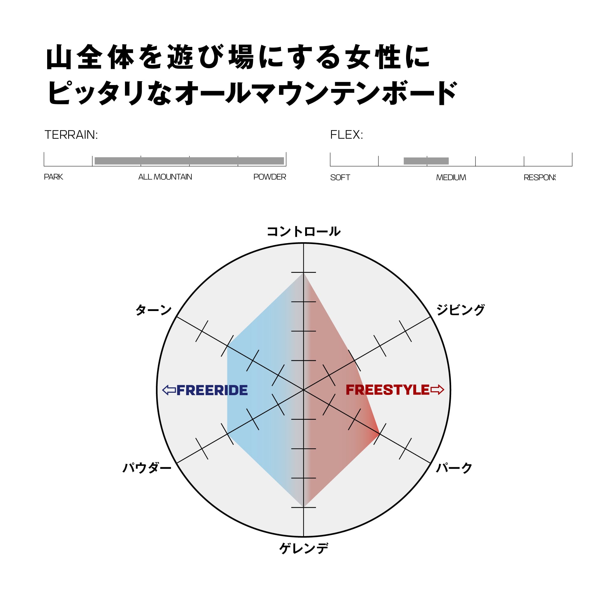 『Blissは山全体を遊び場にする女性にピッタリなフリーライドにインスパイアされたシェイプを持つオールマウンテンボードです。テーパードディレクショナルシェイプがターンの感動と浮力を、クロスプロファイルキャンバーがグルーマーでの安定性を提供します。エコフレンドリーなコルクレールとリサイクル素材を採用し、環境への負荷を軽減しながらスムーズな乗り味を実現しました』