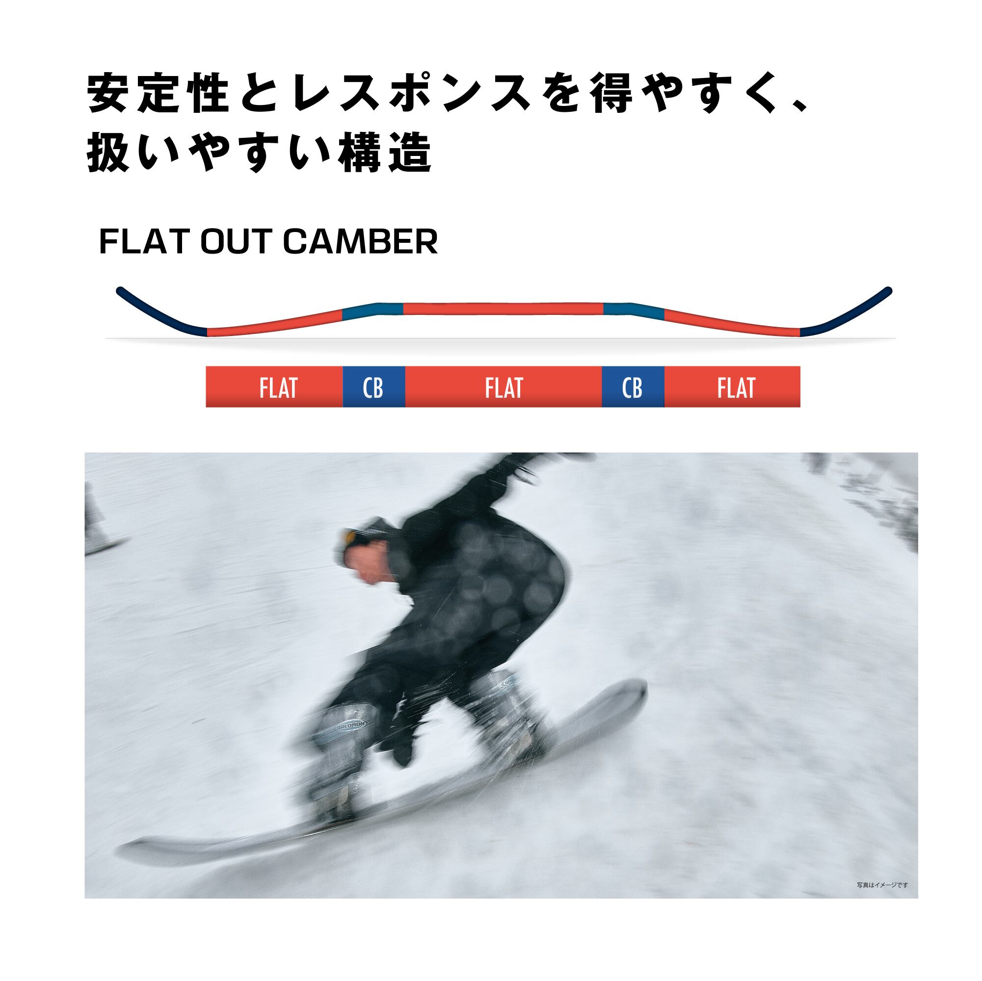 フラットアウトキャンバーは、ティップ/テールとバインディング間に直線が配備され、足元にキャンバーを配置することで必要なときに安定性とレスポンスが得られます。