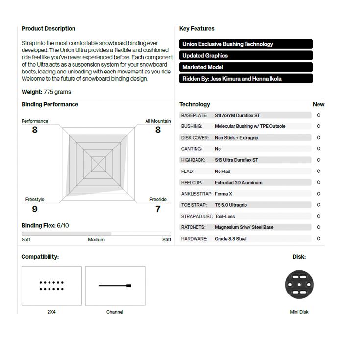 6度の前傾がブーツを包み込み、エッジからエッジへの素早い反応を可能にします。まったく新しいモレキュラーハイバックブッシングが、ライディング中のフリースタイルのフレックスとリバウンドを向上させます。このユニークなハイバック構造は、Union Binding Companyだけのものです。