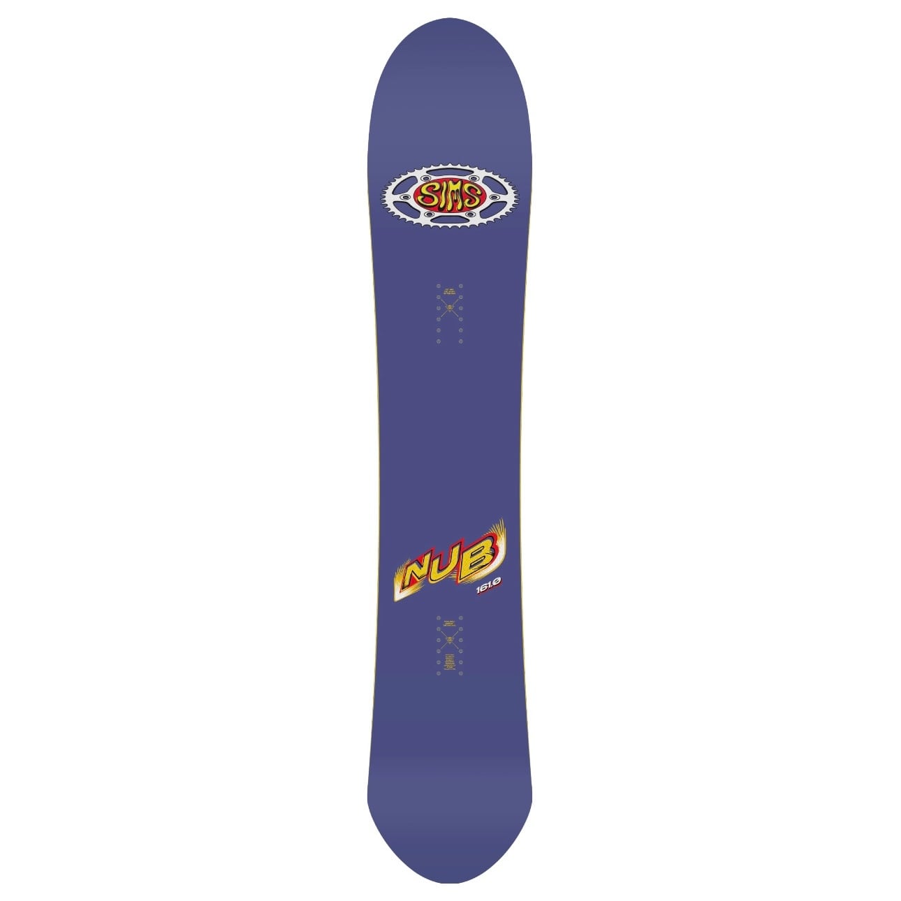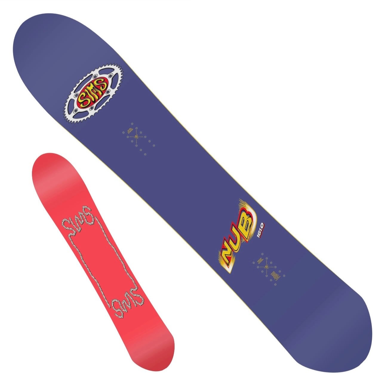 ロングノーズのツインシェイプ、進化的なサイドカットのNubは一見ディレクショナルボードだが、ツインチップのサイドカット径をベースにしている。Nubでスイッチ着地したりスイッチライドすれば、ディレクショナルシェイプで感じる違和感は一切ない。ロングノーズはパウダーでの浮力をサポートし、推奨スタンスでスイートスポットにポジショニングすればトラディショナルなキャンバーボードのような安定感を得ることができる。NubはSIMSチームライダーのスコット・ブラムのお気に入り。ニック・ダークスによるボードグラフィック。