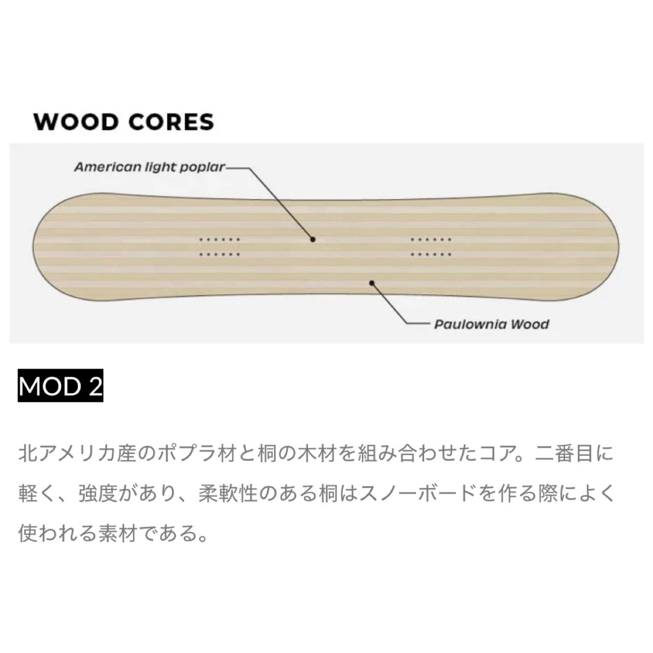 ■北アメリカ産のポプラ材と桐の木材を組み合わせたコア。二番目に軽く、強度があり、柔軟性のある桐はスノーボードを作る際によく使われる素材である。