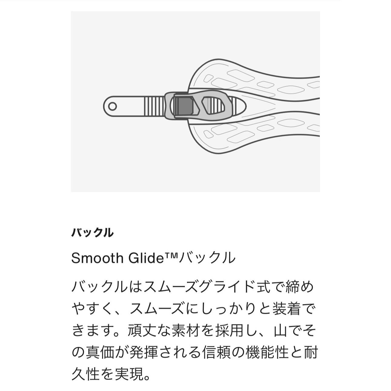 バックルはスムーズグライド式で締めやすく、スムーズにしっかりと装着できます。頑丈な素材を採用し、山でその真価が発揮される信頼の機能性と耐久性を実現。