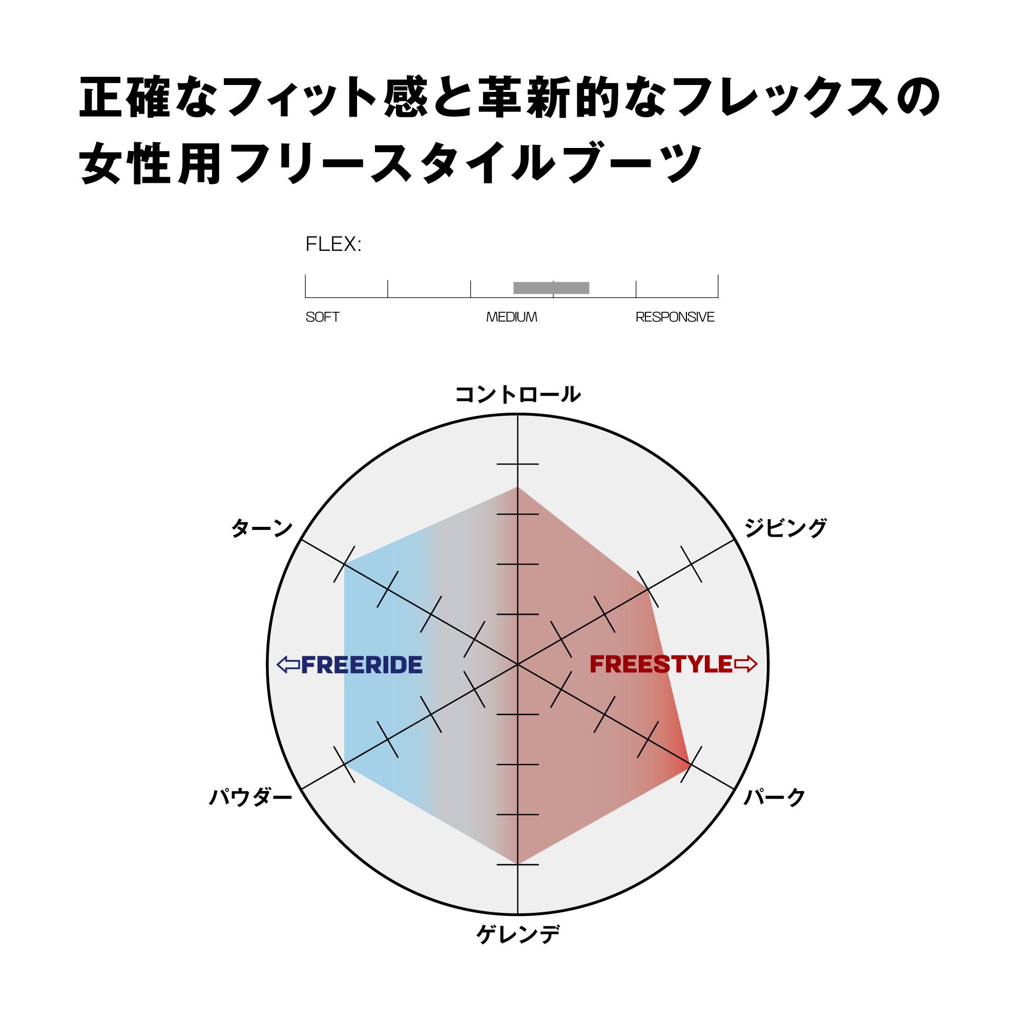 デュアルゾーン構成により2つの独立したダイヤルとレースはブーツ上部と甲の締め分けてしっかり締める。上部はフロントダイヤルをフレックスと安定性を確保し、サイドダイヤルで足の甲の部分をしっかり締め上げ最高の反応性とコントロール性能を提供する。