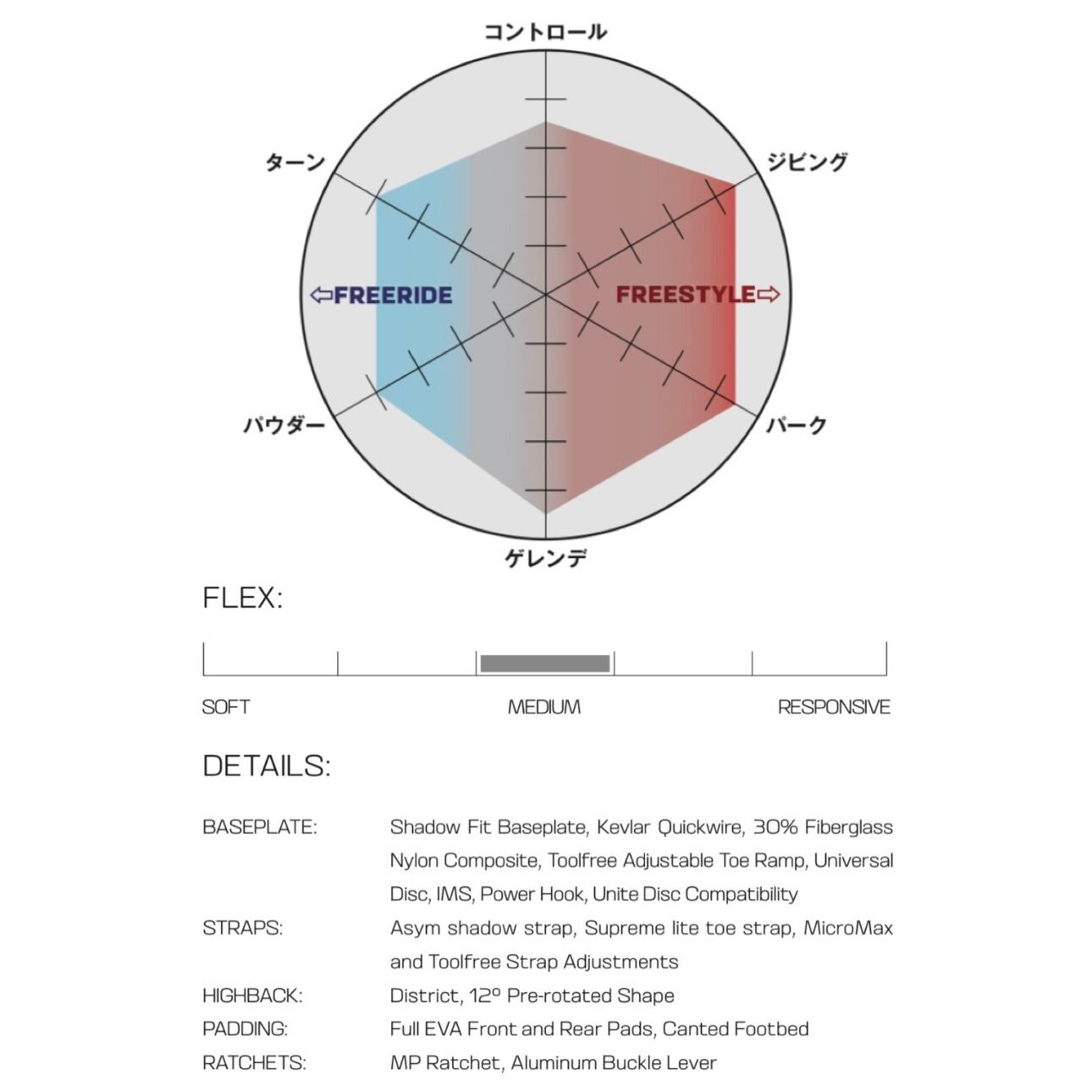 Distrctは柔らかめのフレックスと非対称デザインを採用したパークとグルーマーでの圧倒的な自由度を実現するビンディングです。Shadow Fitヒールカップがバインディングとブーツの一体感を高めることでより高いパフォーマンスと快適性を提供し、非対称ハイバックとインジェクションストラップがサポート力と操作性をバランス良く提供します。