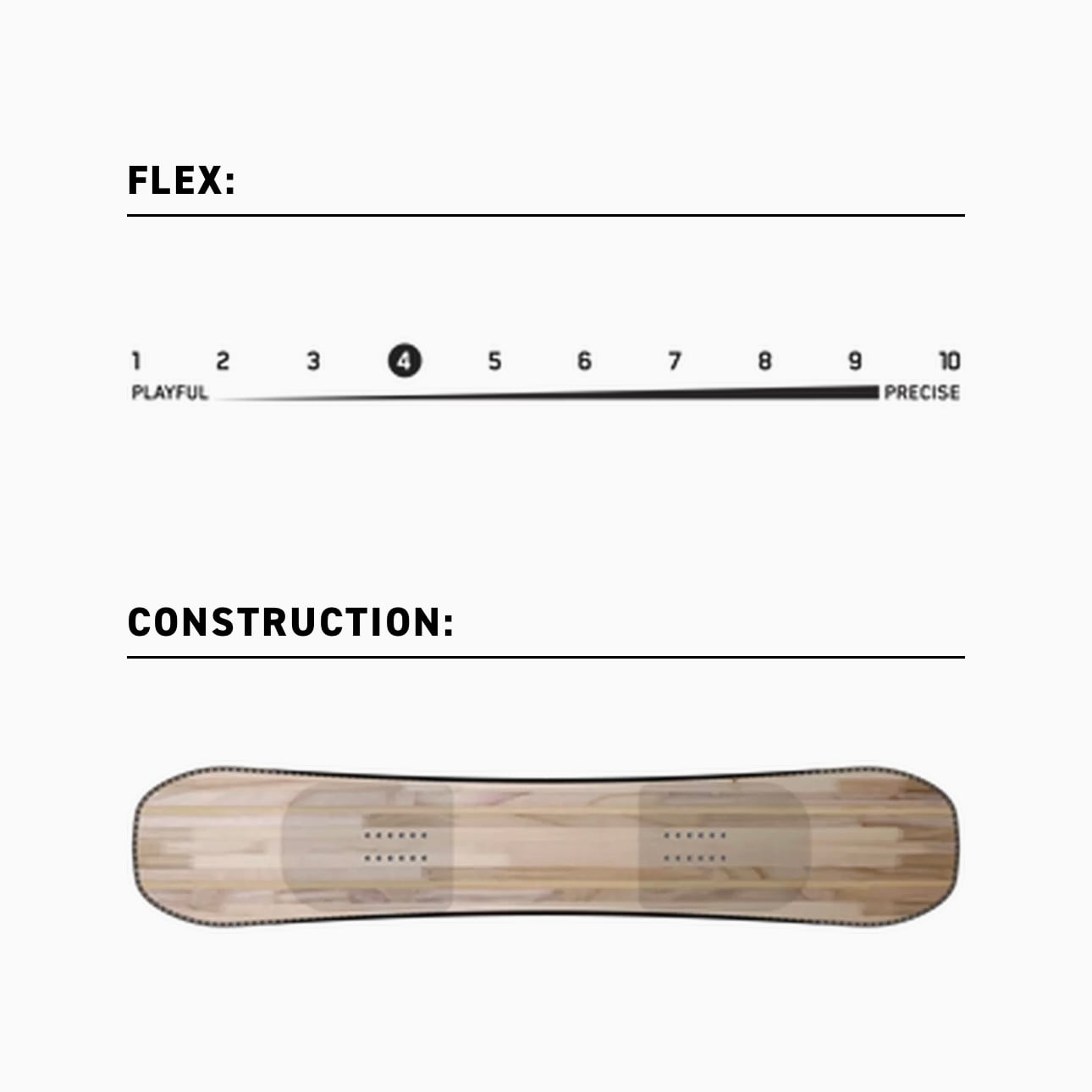 女性スノーボーダーのメカニクス、ジオメトリー、ライディングスタイルを補完する独特のシェイプと設計で、アスペンを多用し、キビキビとした俊敏なコアを作り上げる一方、軽量な桐をチップとテールに配し、スウィングウェイトを軽減し、ターン始動を容易にします。