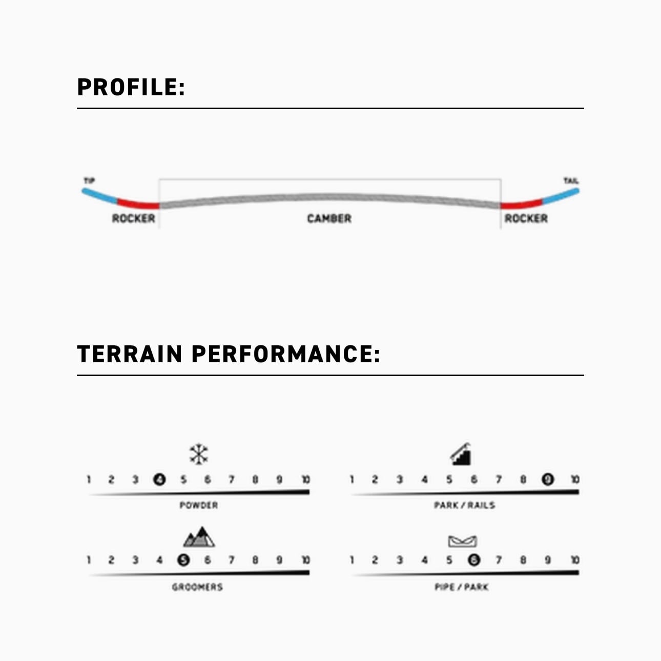 コンビネーション・キャンバー・プロファイル形状は、ボードに活気とキレを与えながら、あらゆる雪質で遊び心と予測性を保ちます。キャンバーはバインディングとバインディングの間に戦略的に配置され、安定感とレスポンスをもたらし、ロッカーはバインディングのすぐ外側からノーズとテールに向かって伸び、引っかかりのないフィーリングを実現しています。