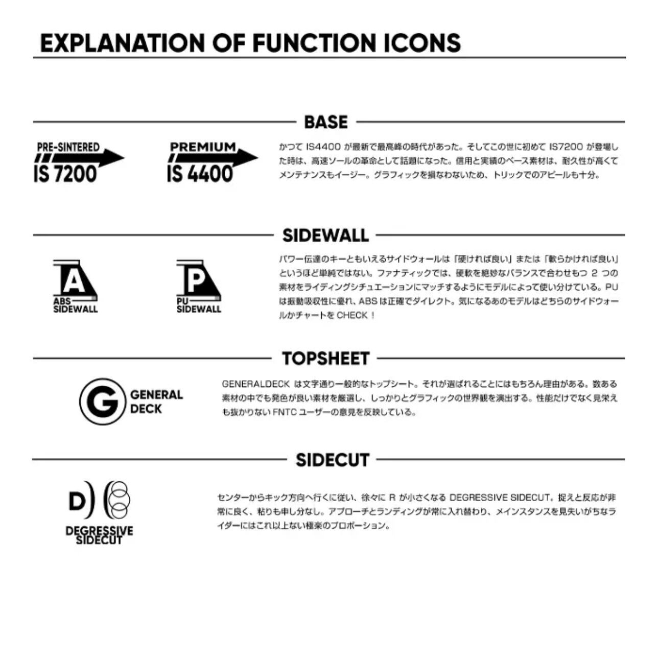 パワー伝達のキーともいえるサイドウオールは「硬ければ良い」または「軟らかければ良い」というほど単純ではない。フアナティックでは、硬軟を絶妙なバランスで合わせもつ2つの素材をライディングシチュエーションにマッチするようにモデルによって使い分けている。PUは振動吸収性に優れ、ABSは正確でダイレクト。気になるあのモデルはどちらのサイドウォールかチャートをCHECK!