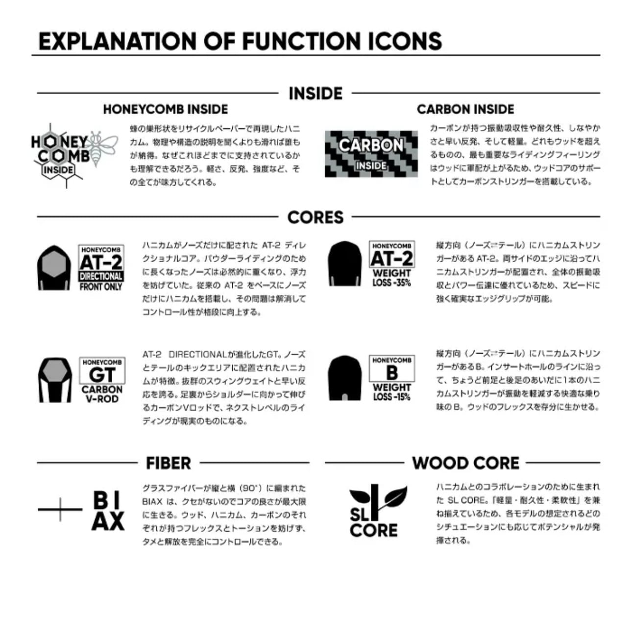 縦方向(ノーズ=テール)にハニカムストリンガーがあるB。インサートホールのラインに沿って、ちょうど前足と後足のあいだに1本のハニカムストリンガーが振動を軽減する快適な乗り味のB。ウッドのフレックスを存分に生かせる。
