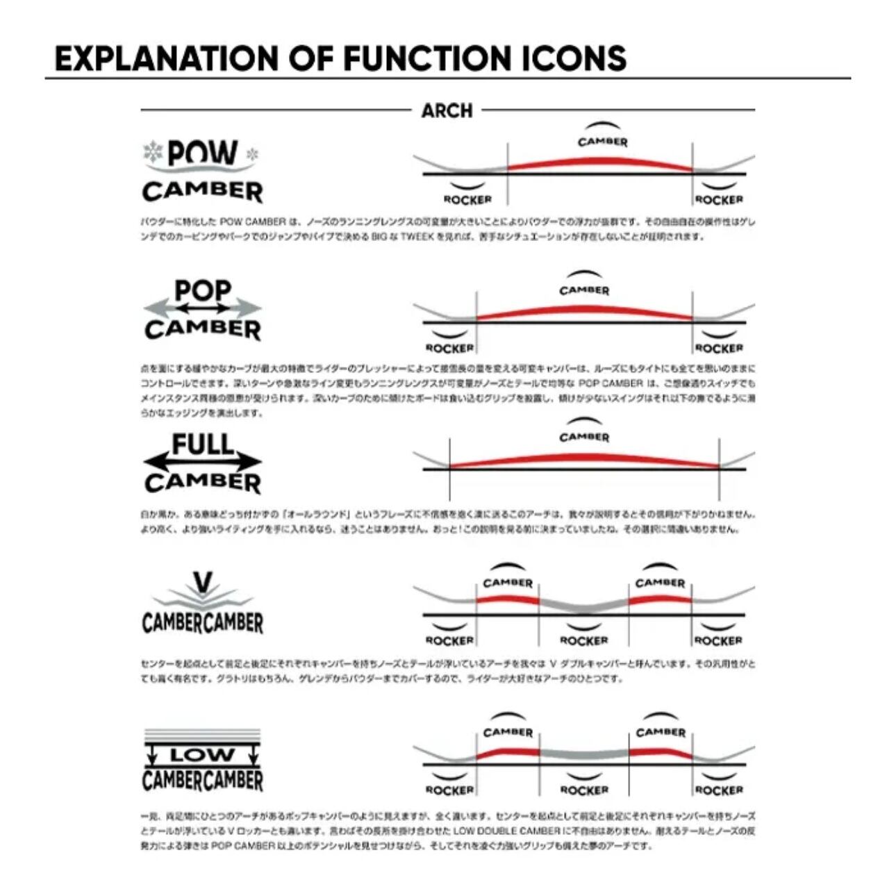 一見、両足間にひとつのアーチがあるポップキャンパーのように見えますが、全く違います。センターを起点として前足と後足にそれぞれキャンバーを持ちノーズとテールが浮いているVロッカーとも違います。言わばその長所を掛け合わせたLOWDOUBLE CAMBERに不自由はありません。耐えるテールとノーズの反発力による弾きはPOP CAMBER以上のポテンシャルを見せつけながら、そしてそれを凌ぐ力強いグリップも備えた夢のアーチです。