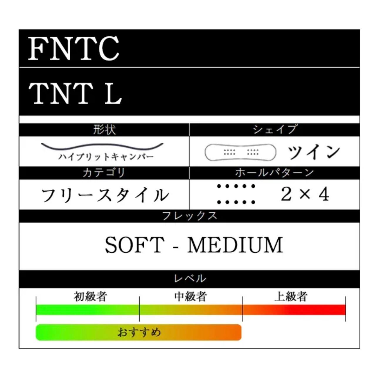 初心者がスノーボード全体を早く上手くなって欲しい。そのためにはターンも練習して早くカービングを習得して欲しい。そして、雪質を選ばすどんなコンディションでも最高のポテンシャルを発揮して欲しい。そんな思いが込められたFNTCが初心者の為にリリースした最高の1本!