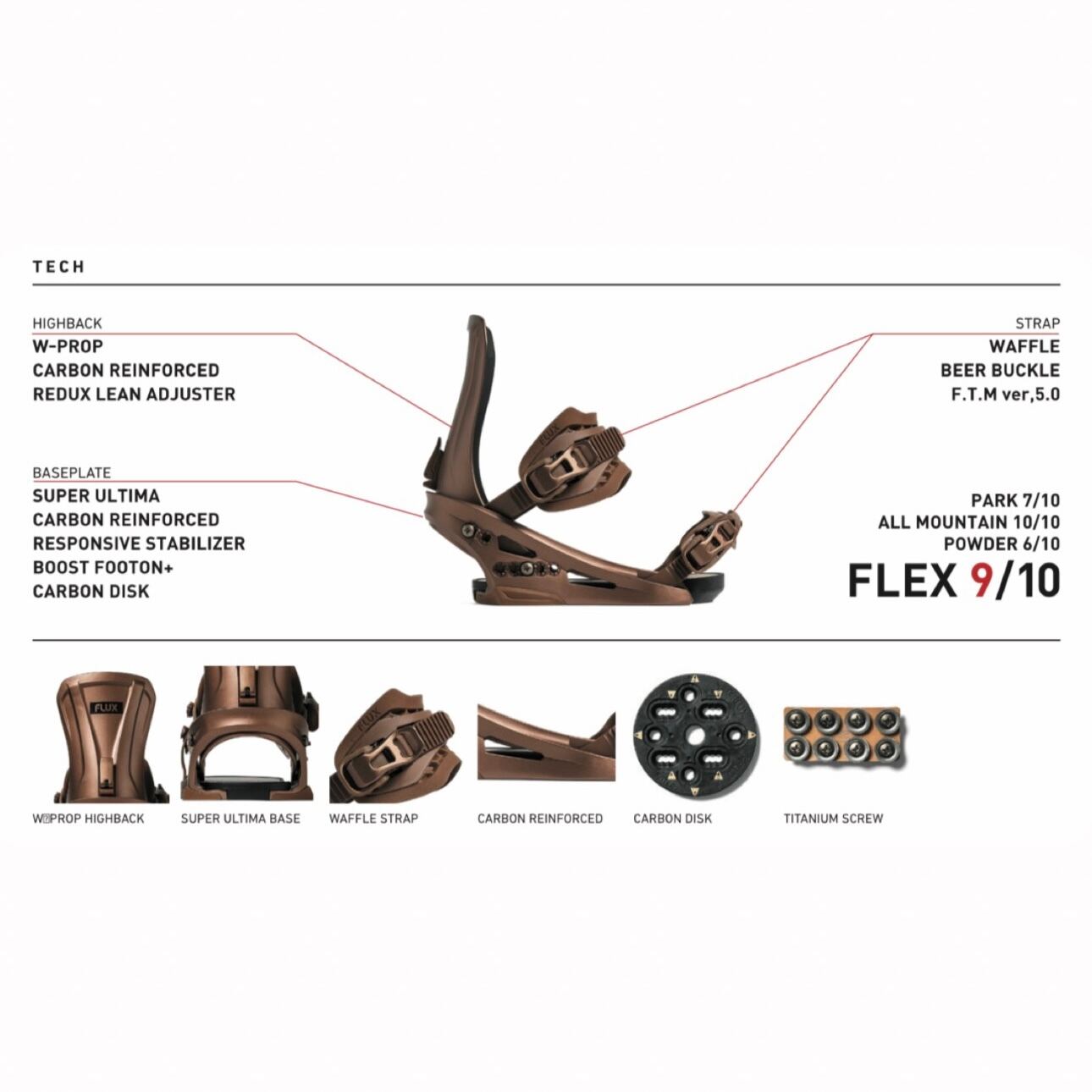 極限の操作性を実現するためにFLUXの技術、素材を惜しみなく注ぎ込んだハイエンドモデル。全モデルの中で唯一ハイバックにもカーボン繊維を混合させ、ハイバックとストラップの取り付けビスにもチタンを採用し、軽量とハイレスポンスを両立させました。カーボンで強化された取り付けディスクと4mm高さをあげたBoost FootOn+はさらにクイックな切り落としと、安定したエッジングを可能にしました。