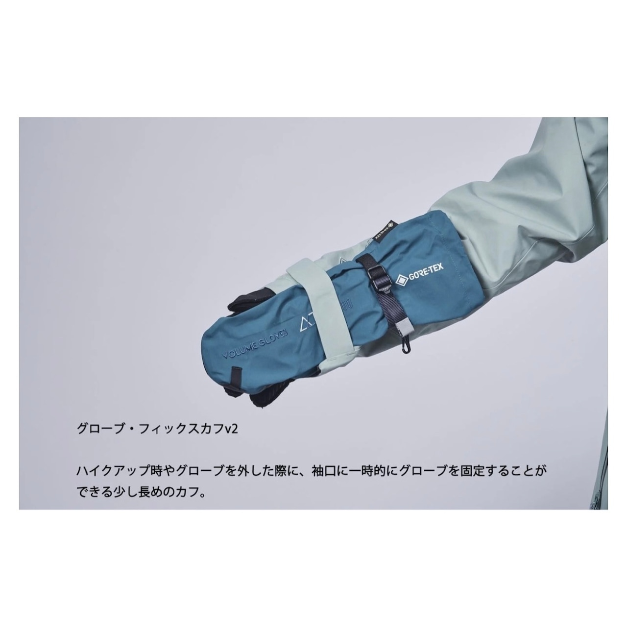 ハイクアップ時やグローブを外した際に、袖口に一時的にグローブを固定することができる少し長めのカフ。