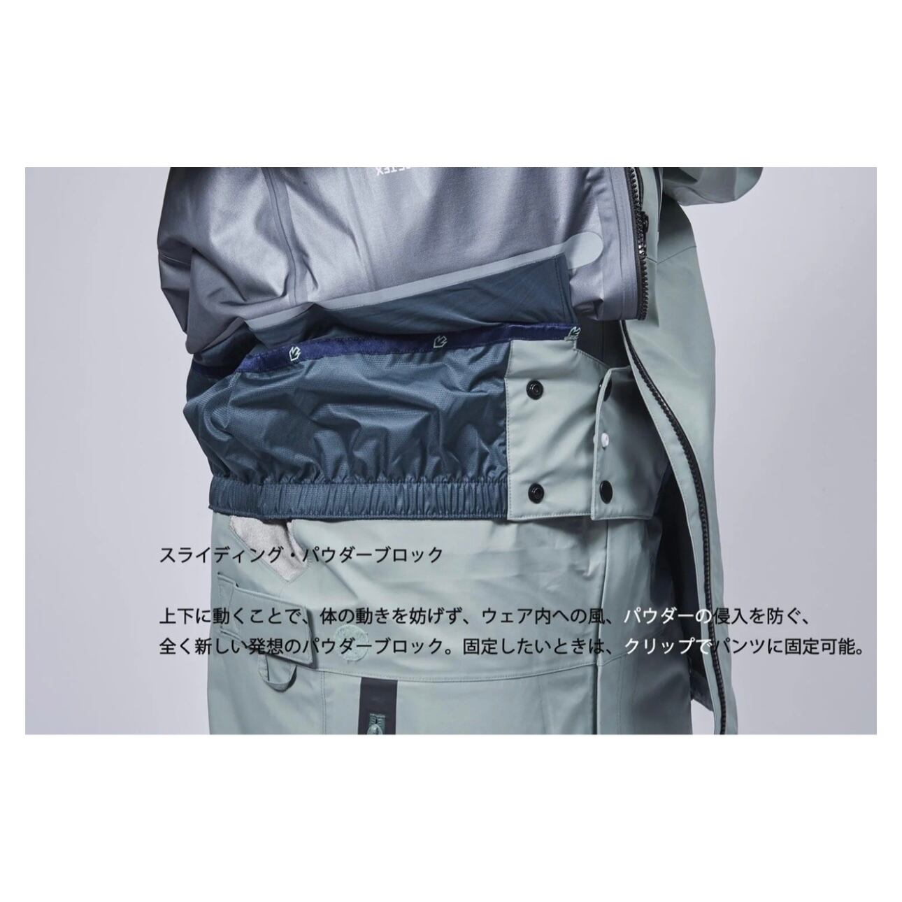 『日本ブランドで、GORE-TEXを使用しデザインする、数少ないバックカントリーウェア。日本人の体型に合わせて作られたパターンは、着心地が良く、ライディングはもちろん、登りの際もストレスはありません。