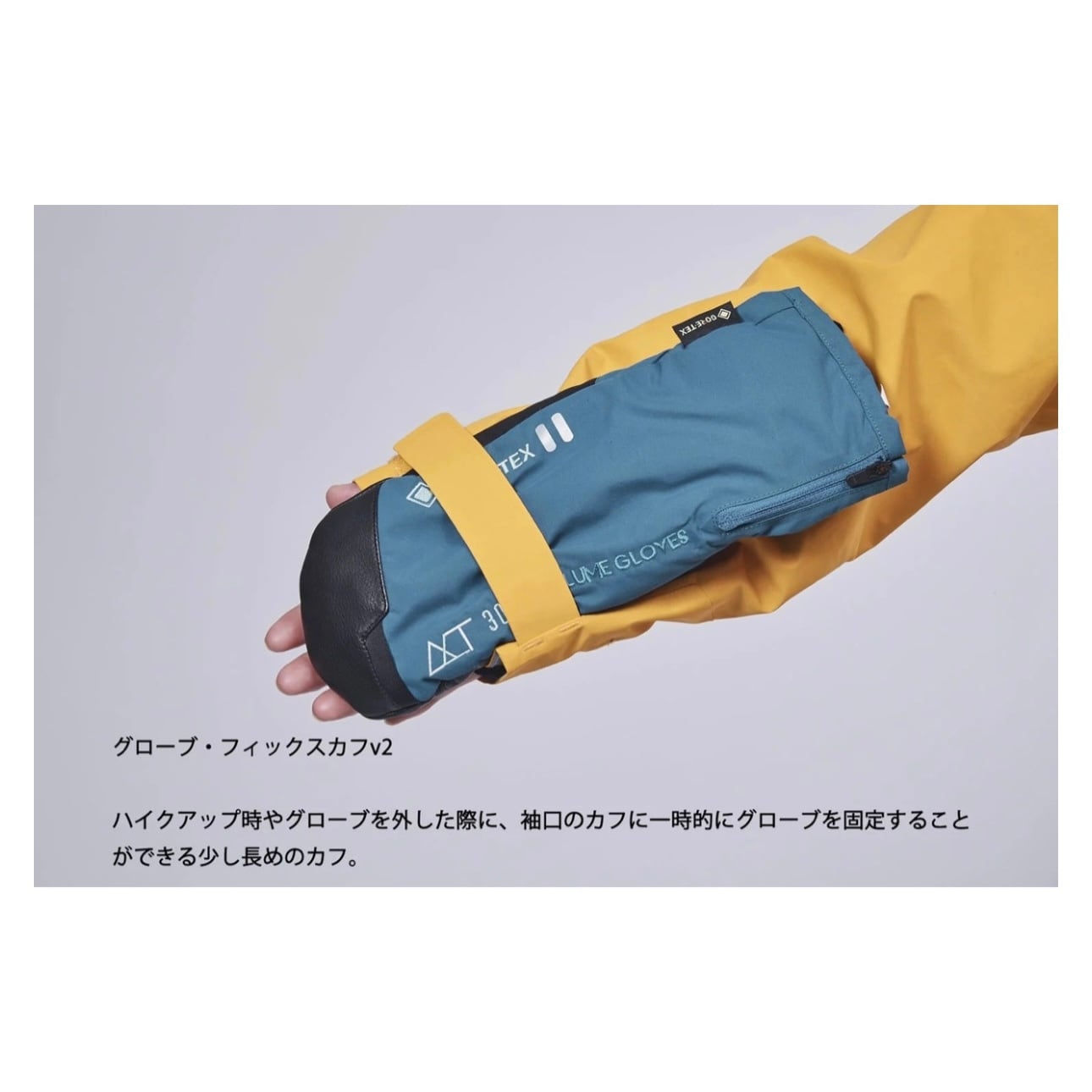 ハイクアップ時やグローブを外した際に、袖口のカフに一時的にグローブを固定することができる少し長めのカフ。