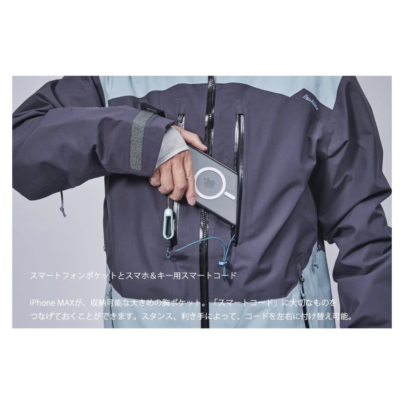 iPhone MAXが、収納可能な大きめの胸ポケット。「スマートコード」に大切なものをつなげておくことができます。スタンス、利き手によって、コードを左右に付け替え可能。