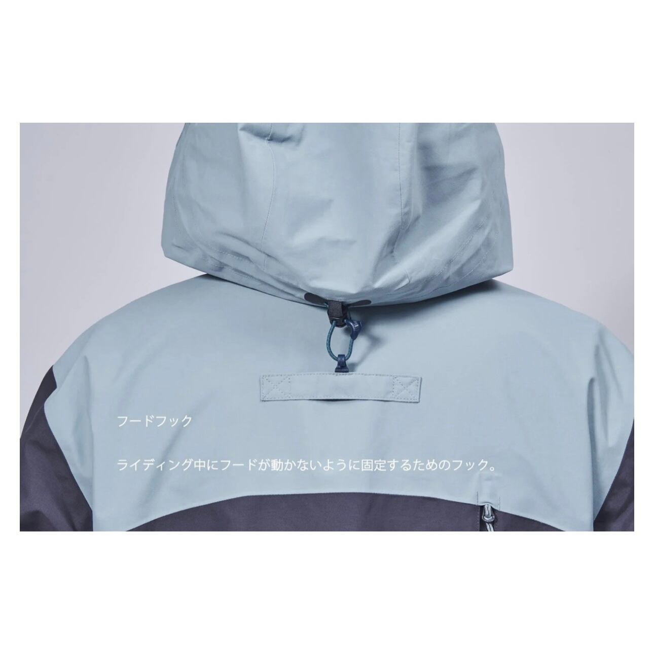 ライディング中にフードが動かないように固定するためのフック。