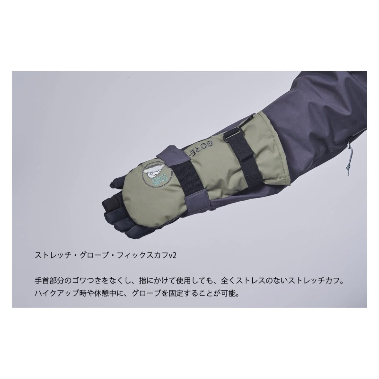 手首部分のゴワつきをなくし、指にかけて使用しても、全くストレスのないストレッチカフ。ハイクアップ時や休憩中に、グローブを固定することが可能。